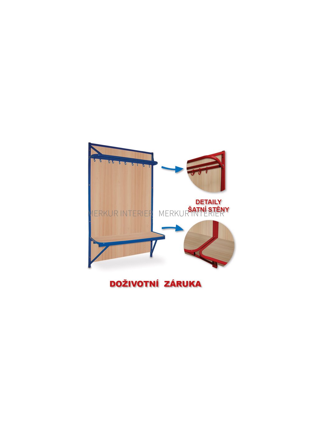 Předností této věšákové stěny je její robustnost a pevnost celé konstrukce. Kostra stěny je vyrobena z jeklu 20 x 30 mm, horní a spodní police je trubka průměr 25 mm. Police určená k sezení a záda věšákové stěny jsou zhotoveny z lamina tl. 18 mm od českého výrobce. Součástí věšákové stěny je 10 posuvných háčků upevněných na horní polici. Délka stěny je 110 cm, hloubka 45 cm, výška 170 cm. Věšákovou stěnu je nutné ukotvit do zdiva pomocí vysokopevnostních šroubů s hmoždinkou, které jsou součástí dodávky. Věšáková stěna je vhodná do školních šaten, školních družin a dětských center. Barevné provedení kovové konstrukce a barvu laminodesky si zvolíte dle vzorníku. Stěnu dodáváme obalenou fólií. Věšákovou stěnu lze omývat vodou a čistit běžnými saponáty, poté je nutné utřít ji do sucha. Všechny ceny, které naleznete v našem katalogu „Školní a kancelářský nábytek“ a na internetových stránkách nebo v e-shopu, jsou včetně DPH. Doprava školního nábytku firmou Merkur Interier s.r.o. je do všech základních škol, mateřských škol, středních škol, vysokých škol a obcí zdarma. Dále lze objednat i montážní práce nebo roznos školního nábytku po škole. Jelikož jsme chráněná dílna, poskytujeme školám náhradní plnění.Doplňkové parametry