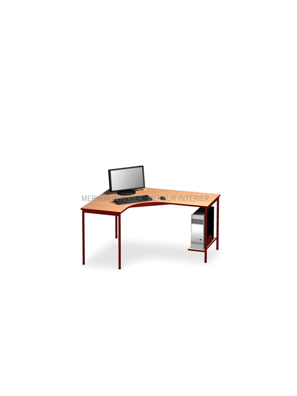 Počítačový stůl je vyroben z laminodesky tloušťky 18 mm od českého výrobce. Na hrany stolu je strojně nalepena ABS tloušťky 2 mm v barvě laminodesky nebo RAL. Podnož počítačového stolu je svařena z uzavřených profilů, nohy jsou z trubky průměr 25 mm a ostatní kovové části jsou z jeklu 20 x 40 mm v barvách RAL. Všechny nohy mají rektifikační šrouby k ustavení stolu do stabilní polohy. Součástí počítačového stolu je police pro počítačovou jednotku s bočním držákem PC jednotky, umístěná na pravé straně stolu. Deska počítačového stolu je opatřena průchodkou a je přichycena ke kovové konstrukci dodanými vruty 4 x 20 mm. Počítačový stůl lze za příplatek dovybavit pojezdem pro klávesnici. Půdorysný rozměr počítačového stolu je 120 x 150 cm (šířka x hloubka), výška 76 cm. Počítačový stůl je určen pro práci s počítačem ve školách a v domácnostech. Je dodáván demontovaný, zvlášť nohy a horní deska, obalený fólií s montážním návodem. Počítačový stůl lze omývat vodou a čistit běžnými saponáty, poté je nutné utřít do sucha. Všechny ceny, které naleznete v našem katalogu „Školní a kancelářský nábytek“ a na internetových stránkách nebo v e-shopu, jsou včetně DPH. Doprava školního nábytku firmou Merkur Interier s.r.o. je do všech základních škol, mateřských škol, středních škol, vysokých škol a obcí zdarma. Dále lze objednat i montážní práce nebo roznos školního nábytku po škole. Jelikož jsme chráněná dílna, poskytujeme školám náhradní plnění.Doplňkové parametry