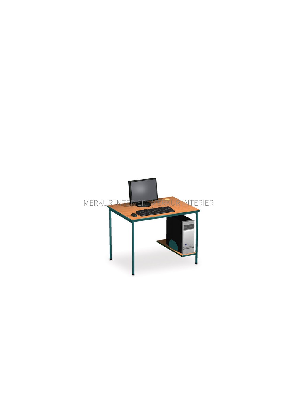 Počítačový stůl je vyroben z laminodesky tloušťky 18 mm od českého výrobce. Na hrany stolu je strojně nalepena ABS tloušťky 2 mm v barvě laminodesky nebo RAL. Podnož počítačového stolu je svařena z uzavřených profilů, nohy jsou z trubky průměr 25 mm a ostatní kovové části jsou z jeklu 20 x 40 mm v barvách RAL. Všechny 4 nohy mají rektifikační šrouby k ustavení stolu do stabilní polohy. Součástí počítačového stolu je police pro počítačovou jednotku s bočním držákem PC jednotky, umístěná na pravé straně stolu. Deska pracovního stolu je opatřena průchodkou a je přichycena ke kovové konstrukci dodanými vruty 4 x 20 mm. Počítačový stůl lze dovybavit za příplatek pojezdem pro klávesnici. Půdorysný rozměr počítačového stolu je 100 x 65 cm (šířka x hloubka), výška 76 cm. Počítačový stůl je určen pro práci s počítačem ve školách a v domácnostech. Je dodáván demontovaný, zvlášť nohy a horní deska, obalený fólií s montážním návodem. Počítačový stůl lze omývat vodou a čistit běžnými saponáty, poté je nutné utřít do sucha. Všechny ceny, které naleznete v našem katalogu „Školní a kancelářský nábytek“ a na internetových stránkách nebo v e-shopu, jsou včetně DPH. Doprava školního nábytku firmou Merkur Interier s.r.o. je do všech základních škol, mateřských škol, středních škol, vysokých škol a obcí zdarma. Dále lze objednat i montážní práce nebo roznos školního nábytku po škole. Jelikož jsme chráněná dílna, poskytujeme školám náhradní plnění.Doplňkové parametry