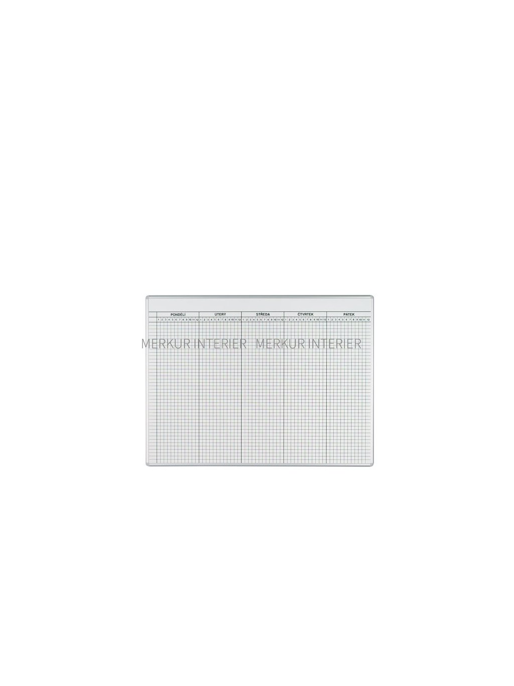 Jednodílná magnetická tabule velikosti 135 x 100 cm pro popis fixem. Horní lišta rozvrhu označuje dny a hodiny v týdnu a levá lišta označuje jednotlivé třídy. K zobrazení vyučujících v jednotlivých hodinách, dnech a třídách slouží barevné magnetické nastříhané pásky s popisem. Každý učitel má svoji barvu a předmět se napíše na magnetický pásek. Rám tabule je z eloxovaného hliníku v přírodním odstínu s plastovými rohy. Rozvrhovou tabuli lze vyrobit také v uzamykatelném provedení jako vitrínu nebo s odkládací lištou na popisovače. Standardně příslušenství pro zavěšení na stěnu. Plánovací tabule jsou užitečným pomocníkem pro efektivní využití času a především rozvrh hodin je ve školách nepostradatelný. Všechny ceny, které naleznete v našem katalogu „Školní a kancelářský nábytek“ a na internetových stránkách nebo v e-shopu, jsou včetně DPH. Doprava školního nábytku firmou Merkur Interier s.r.o. je do všech základních škol, mateřských škol, středních škol, vysokých škol a obcí zdarma. Jelikož jsme chráněná dílna, poskytujeme školám náhradní plnění.Doplňkové parametry