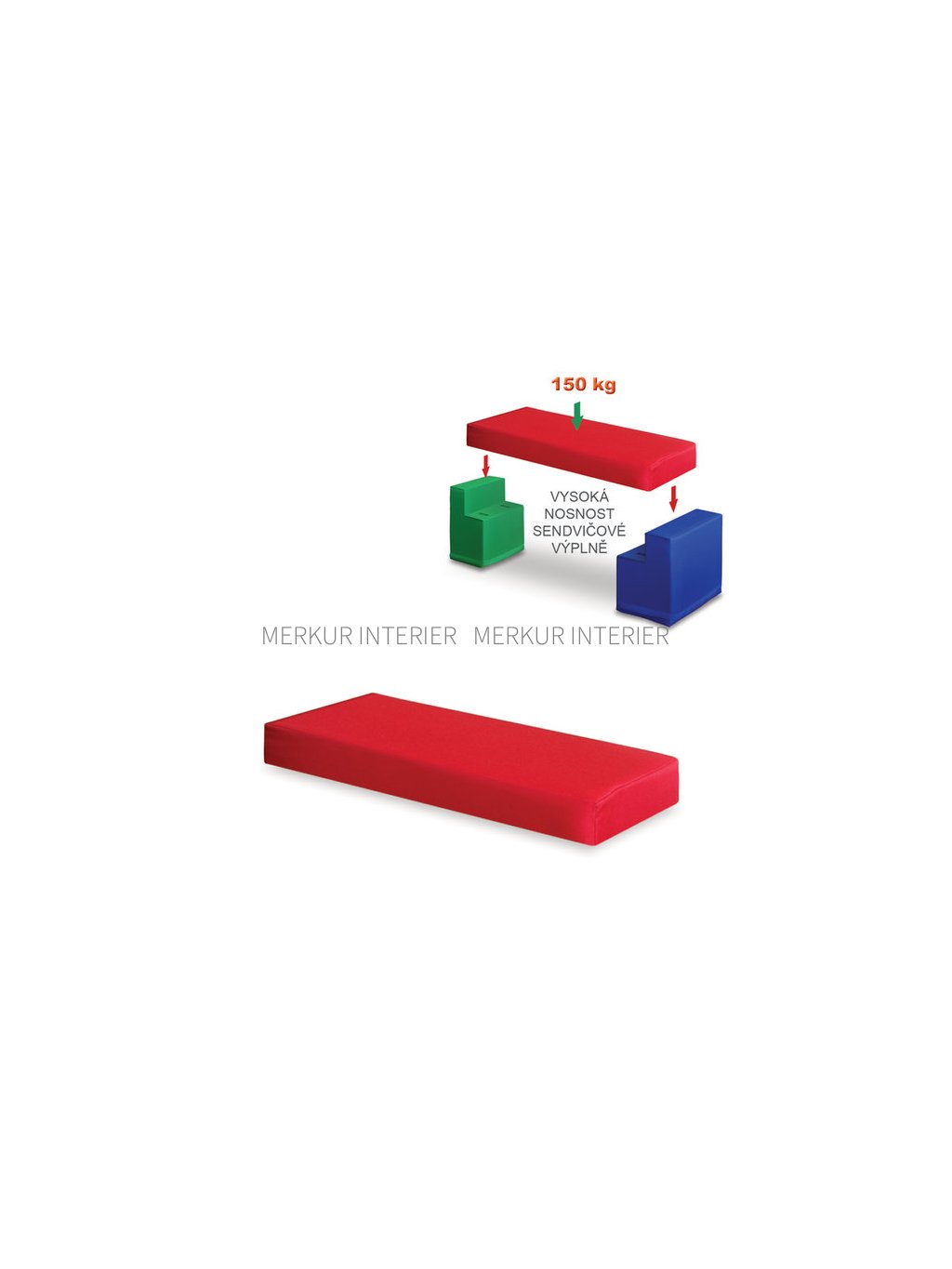 Modulový díl o rozměrech 100 x 38 x 15 cm je vyroben z pevného extrudovaného sendvičového materiálu potaženého vrstvou molitanu. Celý díl je potažený kortexinem, což je vysoce odolná látka proti znečištění, která je lehce omyvatelná. Nelze prá v pračce!!! Nosnost dílu je 150 kg. Ze dvou 2 kusů bočního dílu a jednoho sedacího dílu rychle vytvoříte barevnou a pohodlnou lavičku pro děti. Modulový díl je variabilní a lehce přenosný. Modulové sezení můžete objednat v jednobarevné nebo vícebarevné variantě. Všechny ceny, které naleznete v našem katalogu „Školní a kancelářský nábytek“ a na internetových stránkách nebo v e-shopu, jsou včetně DPH. Doprava školního nábytku firmou Merkur Interier s.r.o. je do všech základních škol, mateřských škol, středních škol, vysokých škol a obcí zdarma. Jelikož jsme chráněná dílna, poskytujeme školám náhradní plnění.Doplňkové parametry