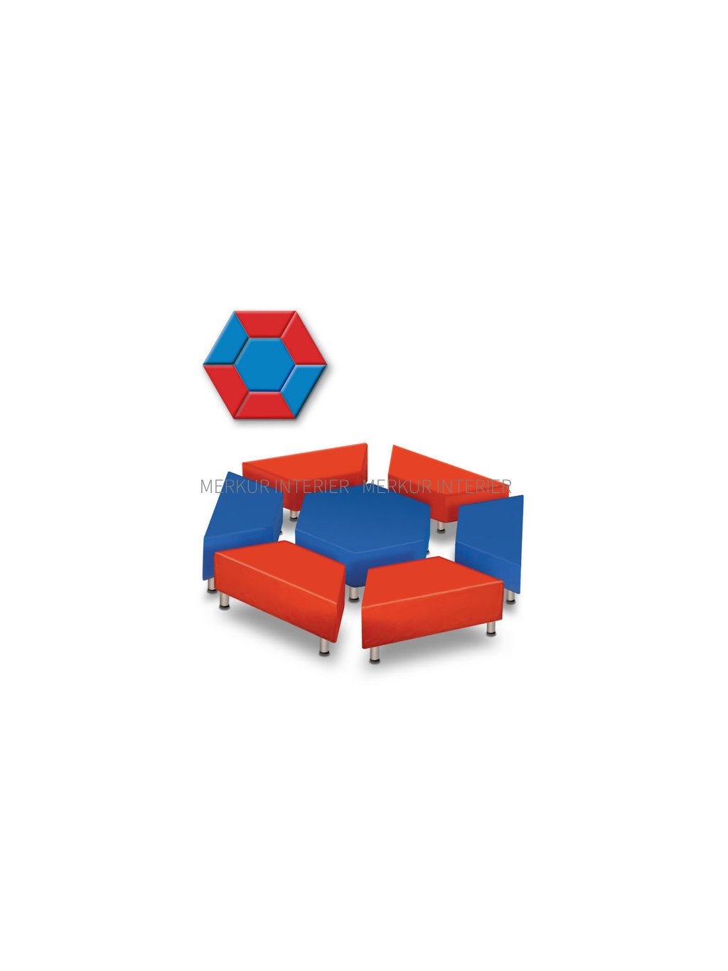 Sezení je složeno z 6 taburetů lichoběžníkového tvaru, rozměr 106 x 46 x 37 cm a 1 taburetu šestiúhelníkového tvaru, rozměr 106 x 92 x 37 cm. Sedací taburety jsou vyrobeny z pevného extrudovaného materiálu potaženého vrstvou molitanu, zpevněné laminodeskou tl. 18 mm a ukončené nerezovými nožičkami. Potahová látka KORTEXIN je velmi kvalitní, vysoce odolná proti znečištění, prachoodpudivá, omyvatelná tkanina. Látka je omyvatelná, špínu stačí utřít mokrým hadrem a otřít do sucha. V případě většího zašpinění lze látku prát na 30 stupňů. Sedací taburety jsou variabilní a lehce přenosné. Nosnost je 150 až 200 kg. Možnost provedení v jednobarevné nebo vícebarevné variantě. Všechny ceny, které naleznete v našem katalogu „Školní a kancelářský nábytek“ a na internetových stránkách nebo v e-shopu, jsou včetně DPH. Doprava školního nábytku firmou Merkur Interier s.r.o. je do všech základních škol, mateřských škol, středních škol, vysokých škol a obcí zdarma. Dále lze objednat i montážní práce nebo roznos školního nábytku po škole. Jelikož jsme chráněná dílna, poskytujeme školám náhradní plnění.Doplňkové parametry
