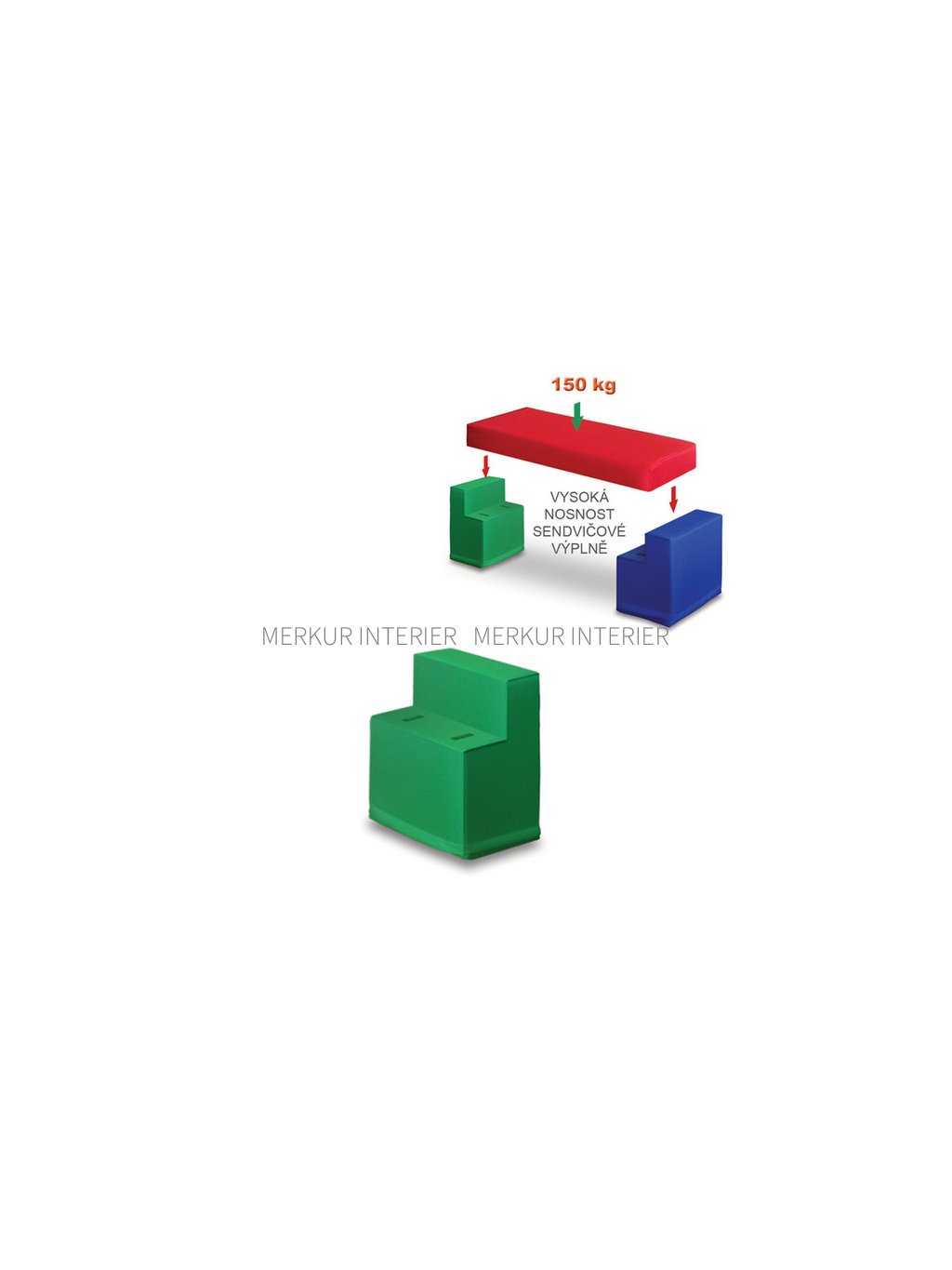 Modulový díl o rozměrech 30 x 38 x 35 cm je vyroben z pevného extrudovaného sendvičového materiálu potaženého vrstvou molitanu. Celý díl je potažený kortexinem, což je vysoce odolná látka proti znečištění, která je lehce omyvatelná. Nelze prát v pračce!!! Nosnost dílu je 150 kg. Ze dvou 2 kusů bočního sendvičového dílu a sedacího sendvičového dílu rychle vytvoříte barevnou a pohodlnou lavičku pro děti. Modulový díl je variabilní a lehce přenosný. Modulové sezení můžete objednat v jednobarevné nebo vícebarevné variantě. Všechny ceny, které naleznete v našem katalogu „Školní a kancelářský nábytek“ a na internetových stránkách nebo v e-shopu, jsou včetně DPH. Doprava školního nábytku firmou Merkur Interier s.r.o. je do všech základních škol, mateřských škol, středních škol, vysokých škol a obcí zdarma. Jelikož jsme chráněná dílna, poskytujeme školám náhradní plnění.Doplňkové parametry