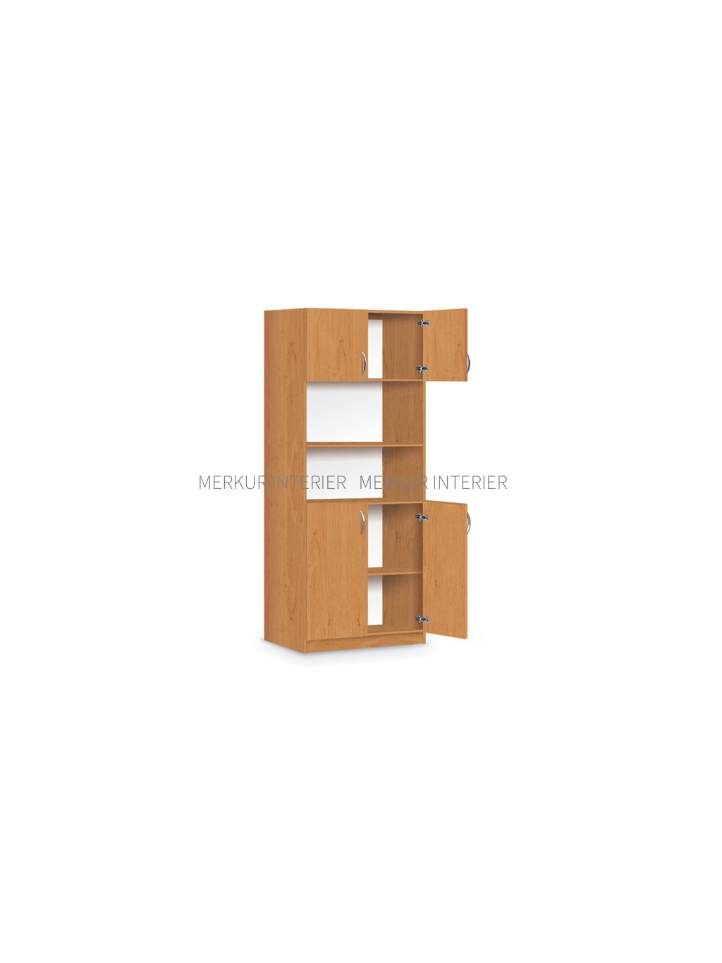 Kancelářská kombinovaná skříň je složena s korpusu skříně, který je zhotoven z laminodesky tloušťky 18 mm od českého výrobce, sololaku tloušťky 3,2 mm bílé barvy a dvířek. Jednotlivé díly korpusu skříně jsou smontovány pomocí truhlářských spojů na sucho. Toto konstrukční řešení naší firmy Merkur Interier s.r.o. je právě výhodné ve školách, kde může dojít vlivem větší zátěže k poškození části skříně. Poté stačí vyměnit pouze poškozený díl. Spodní a horní část skříňky je osazena dvířky s kovovými úchytky obloukového tvaru v barevném provedení zlaté, chromové nebo černé. 2 poličky jsou umístěny na pevno a 2 poličky jsou na podpěrkách s výškovou aretací. Prostor mezi vrchní a spodní částí skříně je vybaven poličkou. Dvířka skříně jsou předsazená před korpus, tzv. naložená dvířka. Panty pro skříň jsou používány NK, otevírané na 90° s možností seřízení dvířek všemi směry a dotahem ke korpusu. Sokl výšky 60 mm. Na dvířkách i korpusu je strojně nalepena ABS tloušťky 0,5 mm v barvě laminodesky. Kancelářskou skříň lze dovybavit větším množstvím poliček, rektifikačními šrouby (při nerovnosti podlahy), registrační mřížkou a zámkem FAB. Půdorysný rozměr skříně je 75 x 36 cm (šířka x hloubka), výška 190 cm. Tato skříň je vhodná například pro šanony do kanceláří, kabinetů, ředitelen, sboroven a je dodávaná celá smontovaná, obalená fólií. Demontovány jsou poličky, podpěrky a kovové úchytky. Skříň nedoporučujeme používat ve třídách a na místech, kde je větší provoz. Pro tyto školní prostory jsou vhodné jiné naše výrobky, například skříně řady 125, 140, 145, 150, 500 a 900. Policovou skříň lze omývat vodou a čistit běžnými saponáty, poté je nutné utřít skříň do sucha. Všechny ceny, které naleznete v našem katalogu „Školní a kancelářský nábytek“ a na internetových stránkách nebo v e-shopu, jsou včetně DPH. Doprava školního nábytku firmou Merkur Interier s.r.o. je do všech základních škol, mateřských škol, středních škol, vysokých škol a obcí zdarma. Jelikož jsme chráněná dílna, poskytujeme školám náhradní plnění.Doplňkové parametry