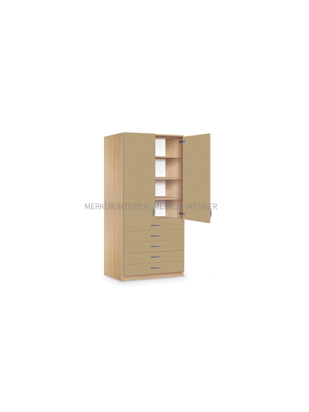 Školní kombinovaná zásuvková skříň je složena z korpusu, který je zhotoven z laminodesky tloušťky 18 mm od českého výrobce, sololaku tloušťky 3,2 mm bílé barvy a dvířek z UNI barvy. Jednotlivé díly korpusu skříně jsou smontovány pomocí truhlářských spojů na sucho. Toto konstrukční řešení naší firmy Merkur Interier s.r.o., je právě výhodné ve školách, kde může dojít vlivem větší zátěže k poškození části skříně. Poté stačí vyměnit pouze poškozený díl. Korpus skříně dodáváme v různém barevném provedení, bílá, šedá a odstíny dřeva. Školní policová skříň je rozdělena střední dělící příčkou, aby se při šířce skříně 90 cm, neprohýbaly police. Dvířka skříně jsou vyrobeny z lamina v UNI barvách, viz. vzorník a jsou předsazená před korpus, tzv. naložená dvířka. Panty pro skříň jsou používány NK, otevírané na 90° s možností seřízení dvířek všemi směry a dotahem ke korpusu. Školní zásuvková skříň má kovové úchytky v obloukovém tvaru, v barvě RAL nebo chrom. Součástí kombinované skříně je 5 nízkých zásuvek na kovových pojezdech a sokl výšky 60 mm. Dvířka, police, zásuvky a korpus jsou strojně olepeny hranou ABS 2 mm v barvě laminodesky. Školní kombinovanou zásuvkovou skříň lze dovybavit větším množstvím poliček, rektifikačními šrouby (při nerovnosti podlahy), zámkem FAB nebo centrálním zamykáním. Půdorysný rozměr skříně je 90 x 47 cm (šířka x hloubka), výška 185 cm. Školní kombinovaná zásuvková skříň je vhodná pro umístění školních pomůcek, nebo jiných kancelářských potřeb odborných kabinetů a učeben chemie, fyziky, přírodopisu a kanceláří. Skříň dodáváme smontovanou a obalenou fólií. Demontovány jsou poličky, podpěrky a kovové úchytky. Školní zásuvkovou skříň lze umístit na chodby, do tříd, kabinetů a odborných kanceláří. Skříň kombinovaná zásuvková je velice odolná a snese velké zatížení. Skříň lze omývat vodou a čistit běžnými saponáty, poté je nutné utřít do sucha. Všechny ceny, které naleznete v našem katalogu „Školní a kancelářský nábytek“ a na internetových stránkách nebo v e-shopu, jsou včetně DPH. Doprava školního nábytku firmou Merkur Interier s.r.o. je do všech základních škol, mateřských škol, středních škol, vysokých škol a obcí zdarma. Jelikož jsme chráněná dílna, poskytujeme školám náhradní plnění.Doplňkové parametry