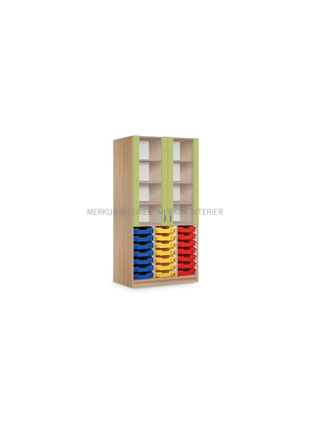 Školní prosklená skříň se 3 boxy je určena pro odborné učebny fyziky a chemie, přírodopisu a počítačové učebny a odborné kabinety. Skříň je velmi odolná a snese velké zatížení, dále se hodí na školní chodby, do tříd a na místech, kde je větší provoz. Skříň je vhodná pro školní pomůcky.