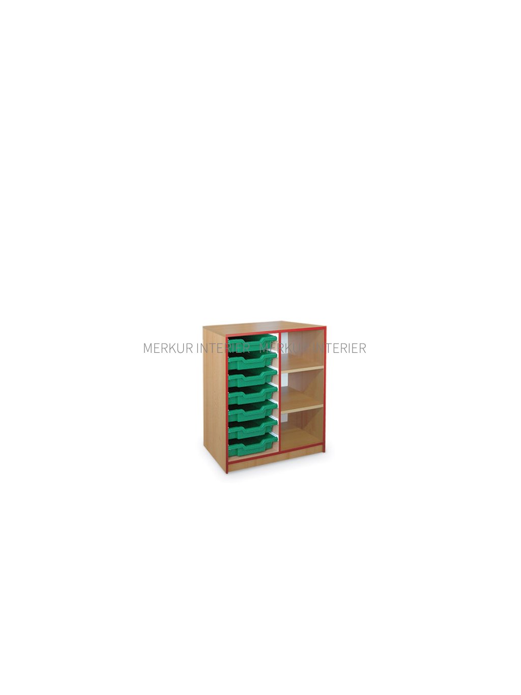 Regálová skříňka je složená z korpusu, který je vyroben dle vzorníku z laminodesky o tloušťce 18 mm od českého výrobce, sololaku bílé barvy tloušťky 3,2 mm a z boxu pro plastové krabičky s pojezdy. Jednotlivé díly korpusu skříňky jsou smontovány pomocí truhlářských spojů na sucho. Toto konstrukční řešení naší firmy Merkur Interier s.r.o. je právě výhodné ve školách, kde může dojít vlivem větší zátěže k poškození části skříňky. Potom je možná výměna pouze části poškozené skříňky. Na korpusu je strojně nalepena ABS hrana tloušťky 2 mm v barvě RAL nebo dle vzorníku laminodesek. Sokl je vysoký 60 mm. Pravý box, kde nejsou plastové krabičky, obsahuje 2 ks 18 mm polic na podpěrkách s výškovou aretací, ohraněné ABS hranou 0,5 mm. Lze vybavit i dalším množstvím poliček a to za příplatek. Součástí ceny skříňky jsou plastové pojezdy v levém boxu, do kterého se vejde 7 plastových krabiček nízkých výšky 7,5 cm nebo 4 střední výšky 15 cm nebo 2 vysoké výšky 30 cm. Počet krabiček v boxu lze různě nakombinovat. Plastové krabičky jsou vyrobeny z lehkého a velmi odolného plastu v různých barvách a nejsou součástí ceny skříňky. Tato skříňka lze také dovybavit i kovovýma nožičkama v různých barvách RAL s plastovou zátkou (nohy výškově nestavitelné nebo stavitelné s rektifikačními šrouby - při nerovnosti podlahy), za příplatek. Půdorysný rozměr skříňky je 80 x 45 cm (šířka x hloubka), výška 85 cm se soklem. Skříňku pro plastové krabičky lze využít samostatně nebo i pro skříňové sestavy do mateřských školek nebo základních škol a družin. Je vhodná pro umístění hraček, knih nebo jiných školních potřeb. Skříňka je dodávána smontovaná a obalená fólií, demontovány jsou pouze volné poličky s podpěrkami a plastové krabičky zvlášť. Skříňku lze omývat vodou a čistit běžnými saponáty, poté je nutné ji utřít do sucha. Všechny ceny, které naleznete v našem katalogu „Školní a kancelářský nábytek“ a na internetových stránkách nebo v e-shopu, jsou včetně DPH. Doprava školního nábytku firmou Merkur Interier s.r.o. je do všech základních škol, mateřských škol, středních škol, vysokých škol a obcí zdarma. Jelikož jsme chráněná dílna, poskytujeme školám náhradní plnění.Doplňkové parametry