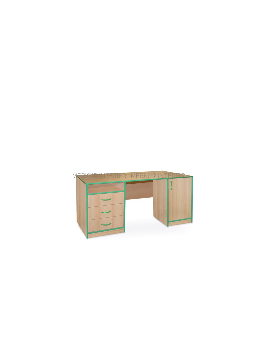 Kancelářský pracovní stůl je zhotoven z laminodesky tloušťky 18 mm od českého výrobce. Jednotlivé díly školního stolu jsou smontovány pomocí truhlářských spojů na sucho. Toto konstrukční řešení naší firmy Merkur Interier s.r.o. je právě výhodné ve školách, kde může dojít vlivem větší zátěže k poškození části stolu. Poté stačí vyměnit pouze poškozený díl. 3 zásuvky kontejneru na levé straně stolu jsou řešeny jako polovýsuvy (zásuvku lze vytáhnout po doraz do 2/3 celkové hloubky zásuvky) na kovových pojezdech. Na pravé straně je skříňka s 1 policí. Dvířkovina zásuvek i skříňky jsou vsazeny do korpusu, tzv. vložená čílka zásuvek nebo vložená dvířka skříňky. Dno zásuvek je z bílého sololaku, boky, čílko a zadní část je z laminodesky. Nad zásuvkami je volně přístupný úložný prostor výšky jedné zásuvky. Zásuvky a skříňka stolu mají kovové úchytky v barvě RAL. Součástí stolu je sokl pod zásuvkovým kontejnerem a skříňkou. Na zásuvkách, skříňce i hranách stolu je strojně nalepena ABS tloušťky 2 mm v barvě RAL. Školní stůl s kontejnerem a skříňkou lze dovybavit zámkem FAB pro horní zásuvku a skříňku, nebo centrálním zámkem pro uzamknutí všech zásuvek a pojezdem pro klávesnici (výrobní číslo 120446) o rozměru 50 x 40 x 10 mm (šířka x hloubka x výška). Půdorysný rozměr stolu je 150 x 75 cm (šířka x hloubka), výška 75 cm. Kancelářský pracovní stůl je vhodný pro použití do kanceláří, kabinetů, ředitelen, sboroven. Pro velkou hmotnost je dodáván demontovaný, zvlášť boky, záda a horní deska, obalený fólií s montážním návodem. Školní stůl lze omývat vodou a čistit běžnými saponáty, poté je nutné utřít ho do sucha. Všechny ceny, které naleznete v našem katalogu „Školní a kancelářský nábytek“ a na internetových stránkách nebo v e-shopu, jsou včetně DPH. Doprava školního nábytku firmou Merkur Interier s.r.o. je do všech základních škol, mateřských škol, středních škol, vysokých škol a obcí zdarma. Dále lze objednat i montážní práce nebo roznos školního nábytku po škole. Jelikož jsme chráněná dílna, poskytujeme školám náhradní plnění.Doplňkové parametry